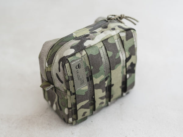 Lightweight, universal general-purpose pouch measuring 150 mm × 150 mm × 80 mm. Designed for PALS mounting in a 4×3 configuration. The pouch is secured with a double-sided YKK® zipper. Inside, a velour (loop) panel allows mounting various accessory inserts. The bottom of the pouch features a drainage hole reinforced with a metal grommet.